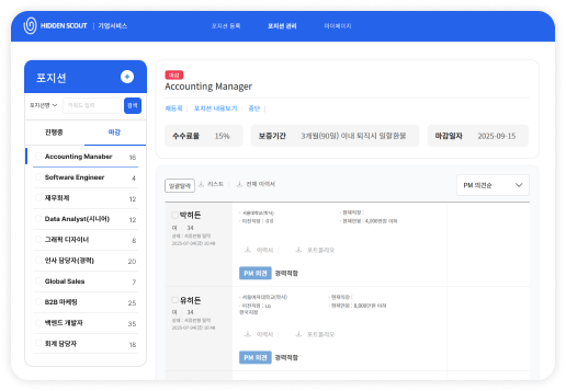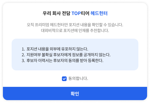 소수 헤드헌터만 포지션 확인이 가능하며 3단계 동의 프로세스에 따라 관리하여 채용 비밀을 유지합니다.
